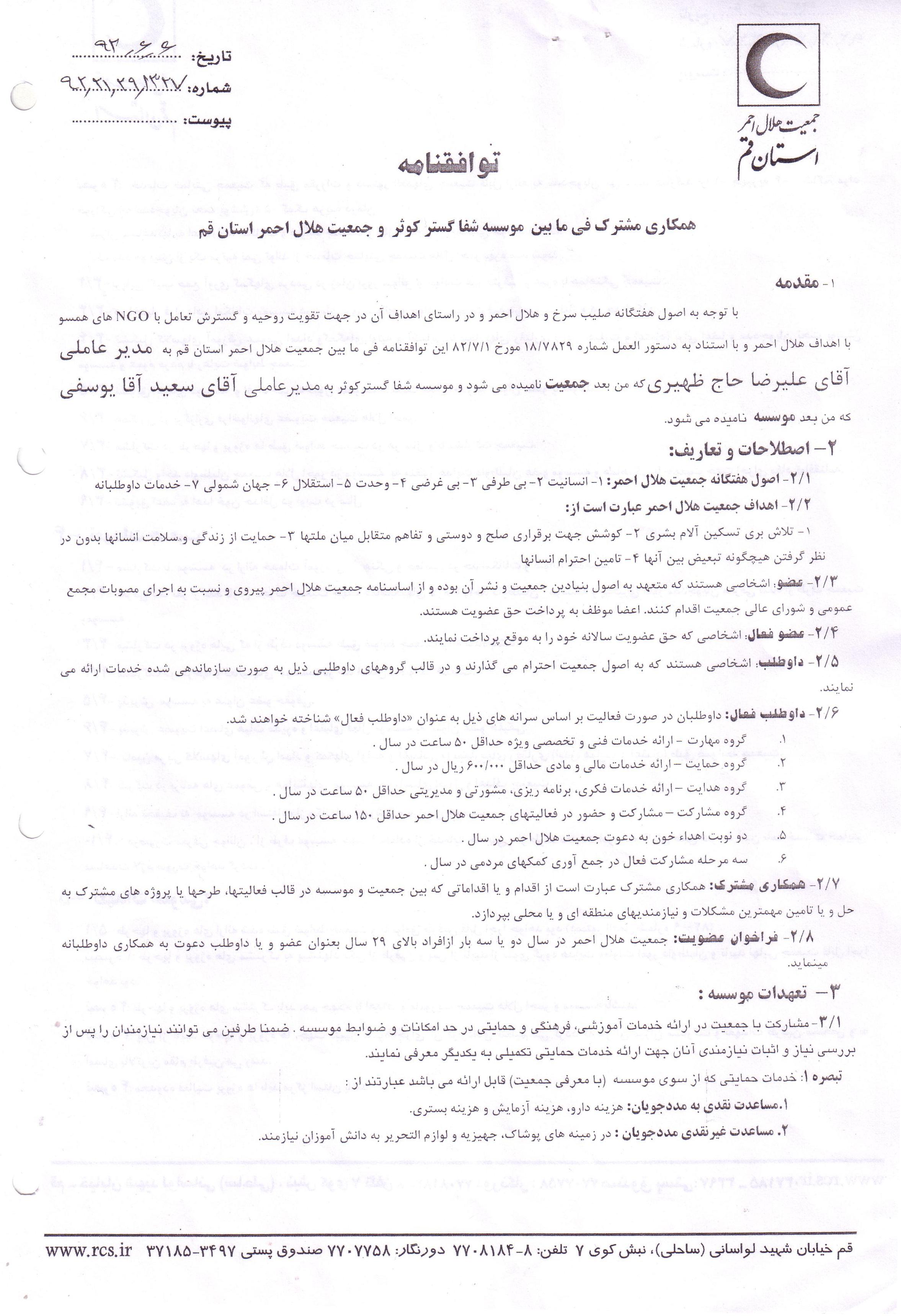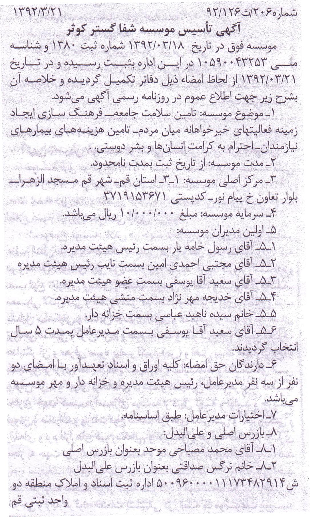 مؤسسه خیریه شفاگستر کوثر در تاریخ 1392/03/18 تحت شماره 1380 و شناسه ملی 10590043253 در اداره ثبت اسناد و املاک کشور به ثبت رسیده است... ایمیل ارتباطی ما... shafa.kosar@chapar.in